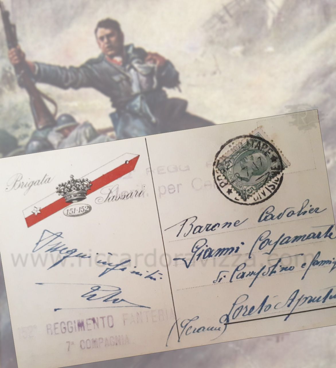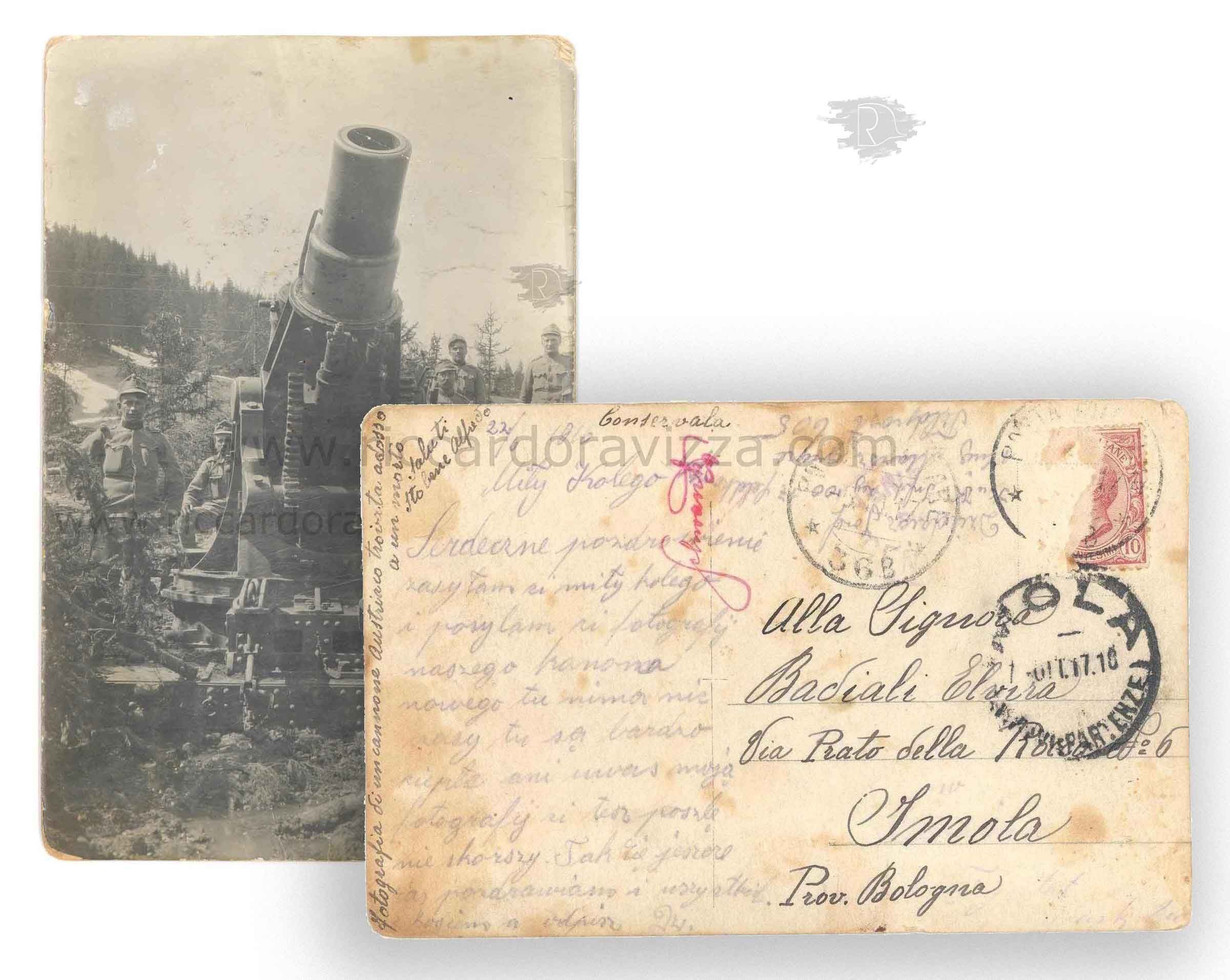 La frase italiana che spicca in questa cartolina souvenir di preda bellica, scritta nel giugno del 1916 da un soldato dell'Impero asburgico ma spedita da un soldato italiano verso Bologna.