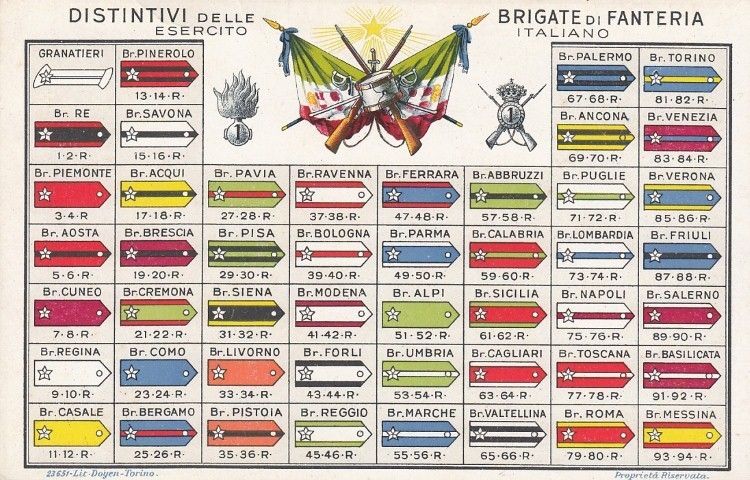 Le mostrine delle brigate di fanteria che si sono battute durante la Grande Guerra, con i corrispettivi distretti di reclutamento. Tutti le mostrine e i colori per poterle riconoscere.