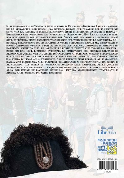 Il servizio di leva in Tempo di Pace ai tempi di Francesco Giuseppe I nelle caserme della monarchia asburgica. Una ricerca basata sull’analisi delle cartoline edite tra la nascita di quelle illustrate (1871) e le grandi manovre in Bosnia - Erzegovina che portarono all’attentato di Sarajevo (1914). Le cartoline scelte non sono quelle delle grandi firme dell’epoca, già ben note al pubblico, bensì quelle edite da piccole case editrici sparse nel territorio della monarchia asburgica e illustrate da disegnatori a volte veramente capaci ma dimenticati o ignoti. Cartoline viaggiate per le più varie destinazioni, cartoline in arrivo e in partenza anche da quel palazzo delle poste di Trieste che svolge la sua funzione sin dal 1894. L’autore evidenzia le similitudini del servizio militare di allora con quello vissuto anche in Italia sino a pochi anni orsono, suddividendo il volume in capitoli che narrino le varie fasi del servizio, dall’Assentierung (la visita di leva) alla vestizione, dalle esercitazioni formali alle manovre, dalla vita quotidiana alle punizioni per arrivare ai sospirati ultimi 100 giorni e al congedo.  La scelta di pubblicare accanto alle cartoline, nelle quali si vedono particolari oggetti di equipaggiamento, gli oggetti stessi appartenenti alla collezione dell’autore rende la lettura maggiormente stimolante e adatta a un pubblico più vario e curioso.