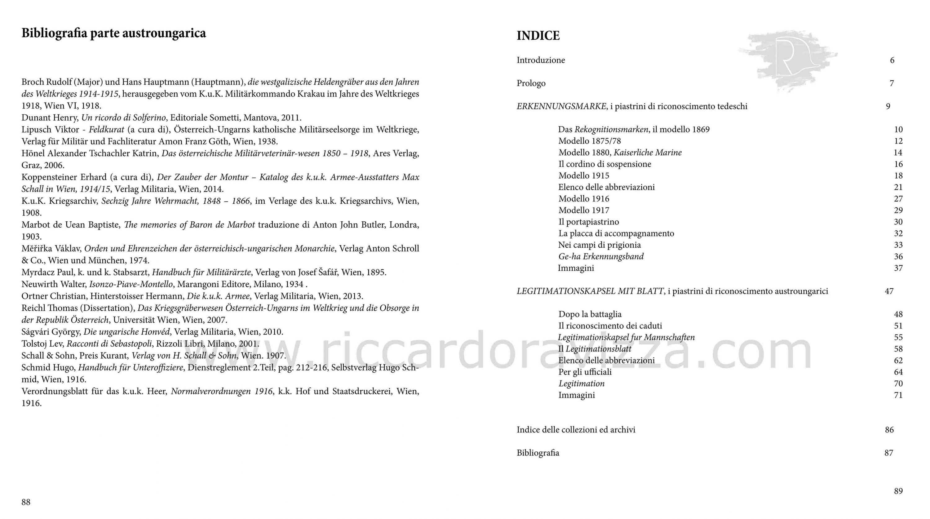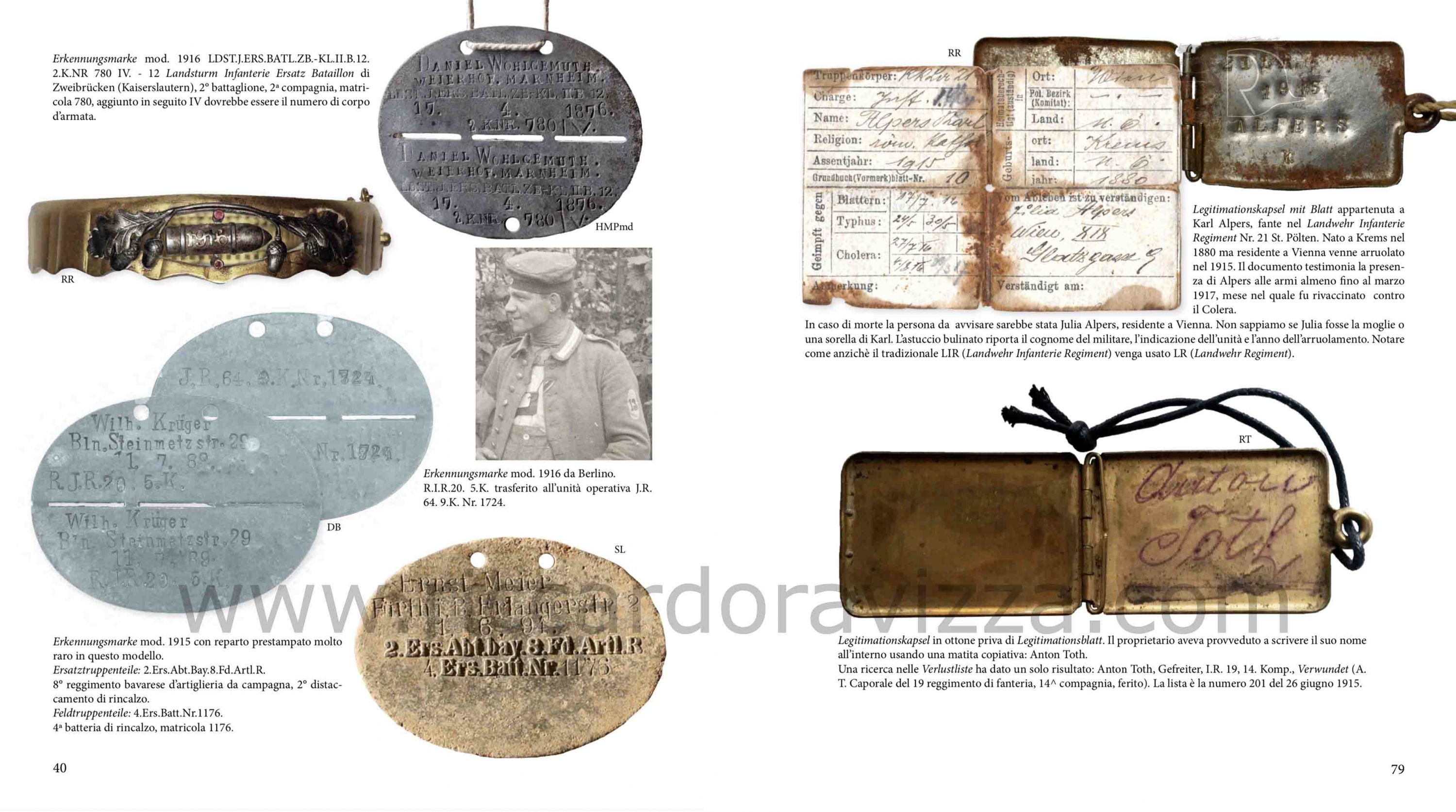 Dopo il primo saggio «Il Piastrino di Riconoscimento» (nel quale ho tracciato l’evoluzione e la nascita dei primi metodi di riconoscimento) propongo, a distanza di un paio d’anni, questa nuova pubblicazione fatta con il valido contributo di Roberto Todero. Assieme abbiamo analizzato e studiato nel dettaglio ogni modello presente nel corso della Grande Guerra nell’esercito imperiale tedesco ed in quello austroungarico. Grazie ad alcune fonti documentaristiche ed iconografiche dell’epoca è stato quindi possibile riconoscere e decifrare i modelli adottati nei due eserciti.